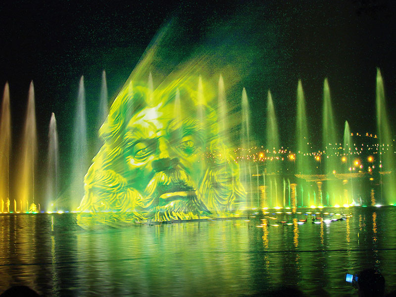 Water curtain laser激光,光色純正,能量集中。利用現(xiàn)代高科技光學(xué)振鏡技術(shù),在水幕噴頭噴出的水幕上形成色彩鮮艷、表...
